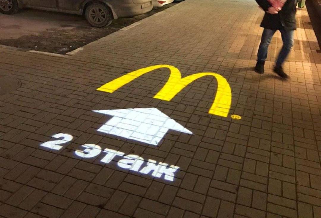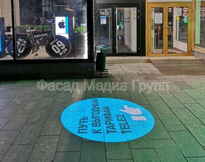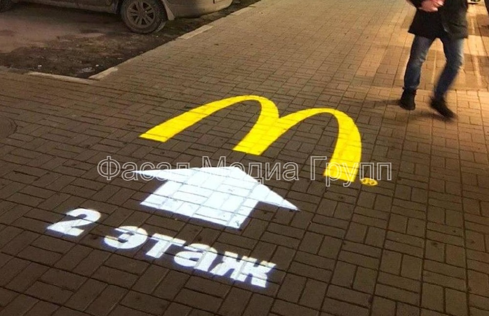 Возникает закономерный вопрос: «Что такое реклама на асфальте?». Реклама на асфальте представляет собой информационное объявление, нанесенное на тротуаре или проезжей части при помощи специальной краски и трафарета или демонстрируемое при помощи высококачественной проекции с применением специальных видеопроекторов (гобо-проекторов). Гобо-проектор – это высококачественный светодиодный проектор, способный демонстрировать как статичное изображение, так и движущуюся картинку.