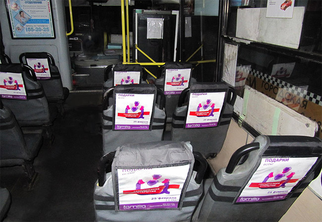 Реклама на подголовниках в троллейбусе на фото выше