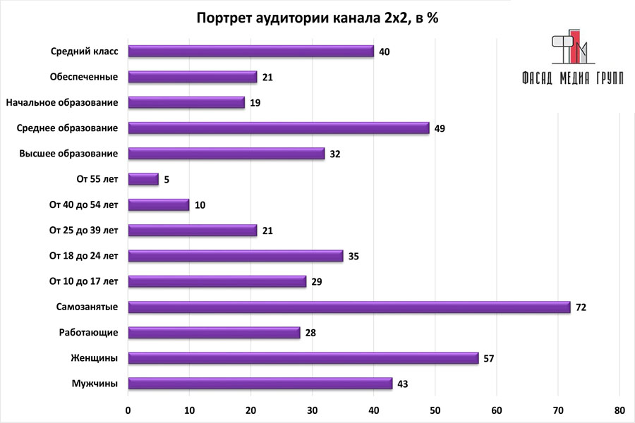 Профиль аудитории: зрителями телеканала «2х2» являются мужчины и женщины, в основном молодежь, работающая, социально активная, экономически состоятельная, ведущая активный образ жизни, интересующаяся новыми гаджетами, миром игр, фантастики, приключений. Покупательная способность находится на среднем уровне.