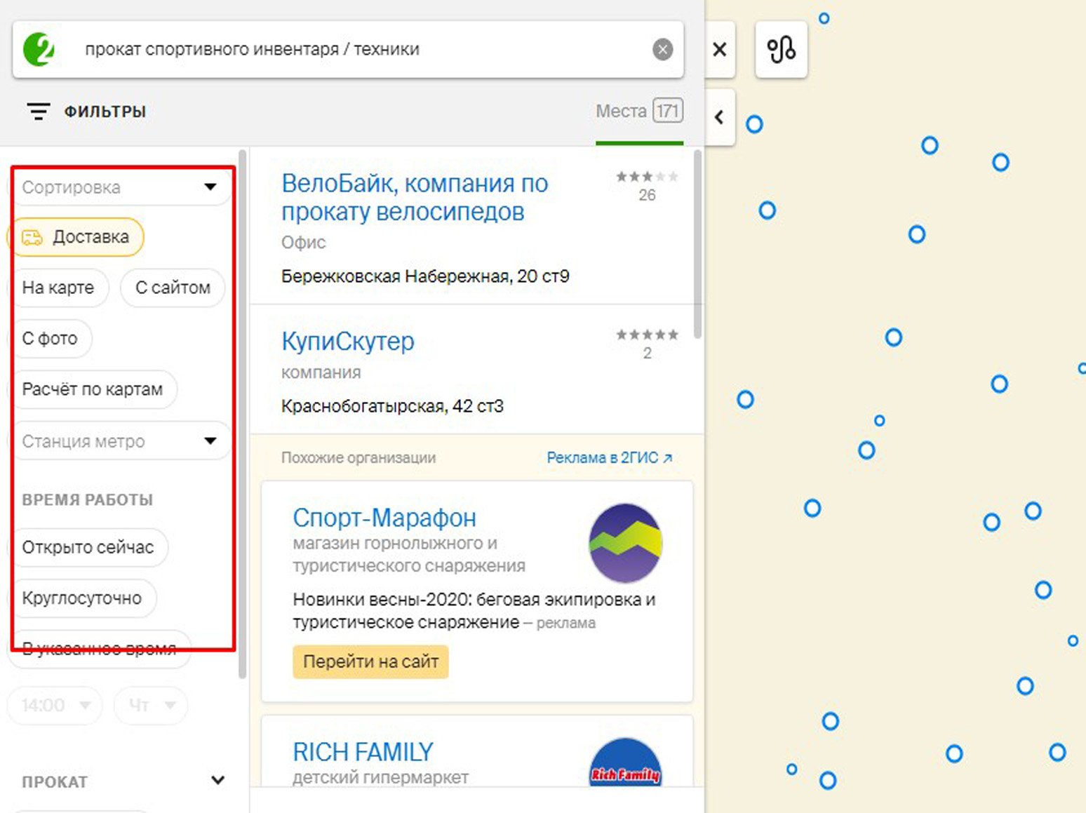 Пример баннер в поисковой выдаче (онлайн-версия) 2ГИС (Двагис, ДубльГис) представлен на фото: