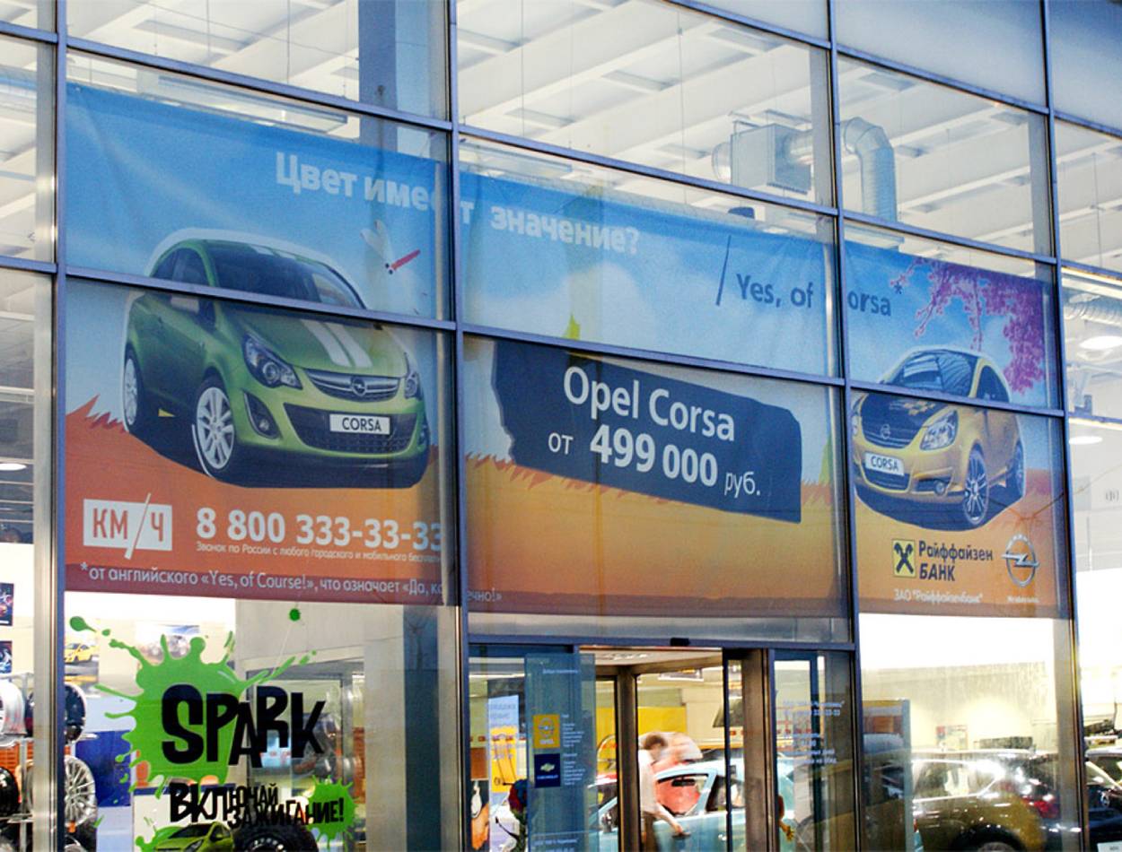 Монтаж рекламы в автосалонах осуществляется по-разному в зависимости от того, какой рекламный материал размещается.